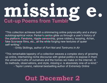 She is the author of missing e. (Fernwood Press, 2025), a forthcoming collection of cut up poetry from Tumblr.
