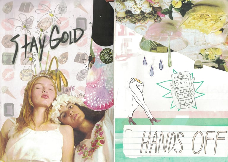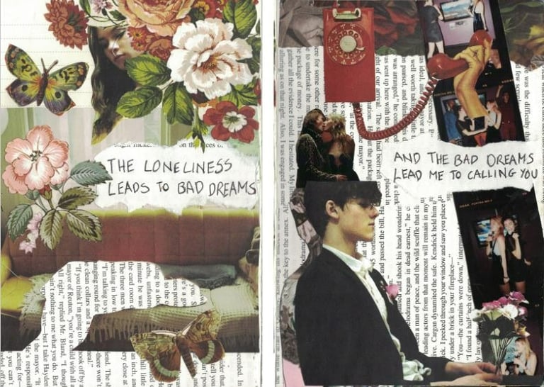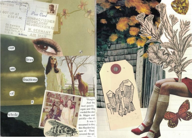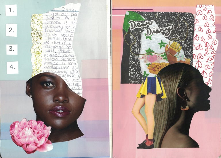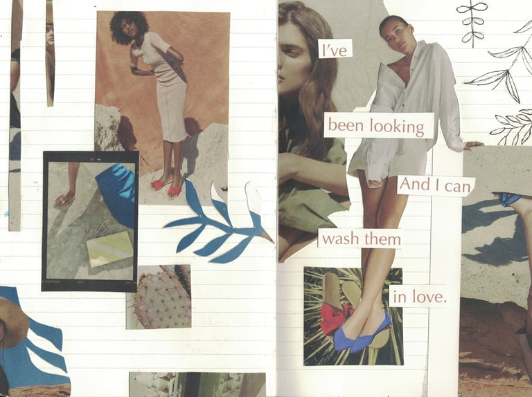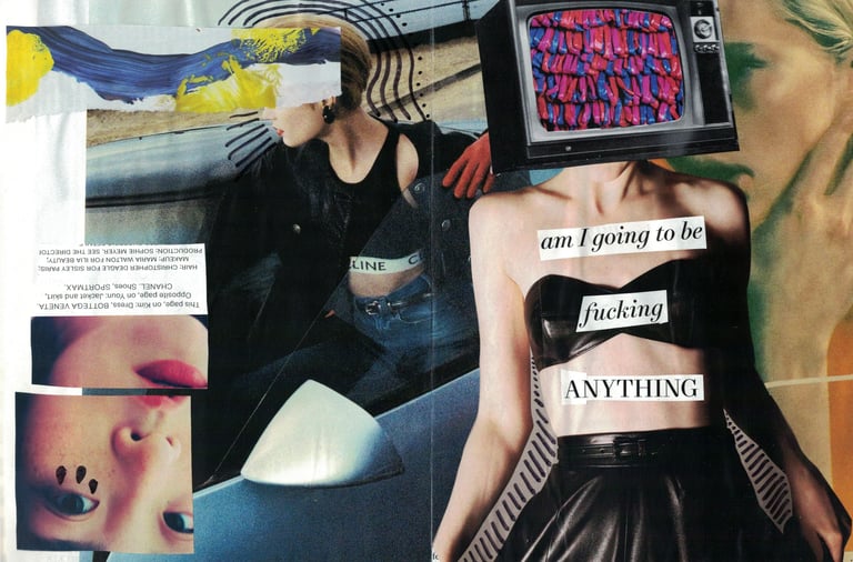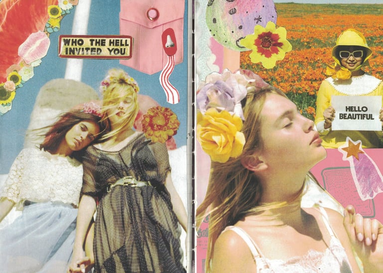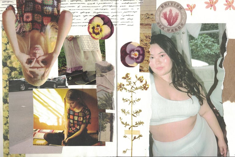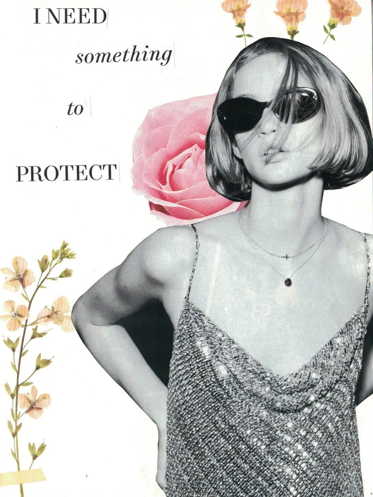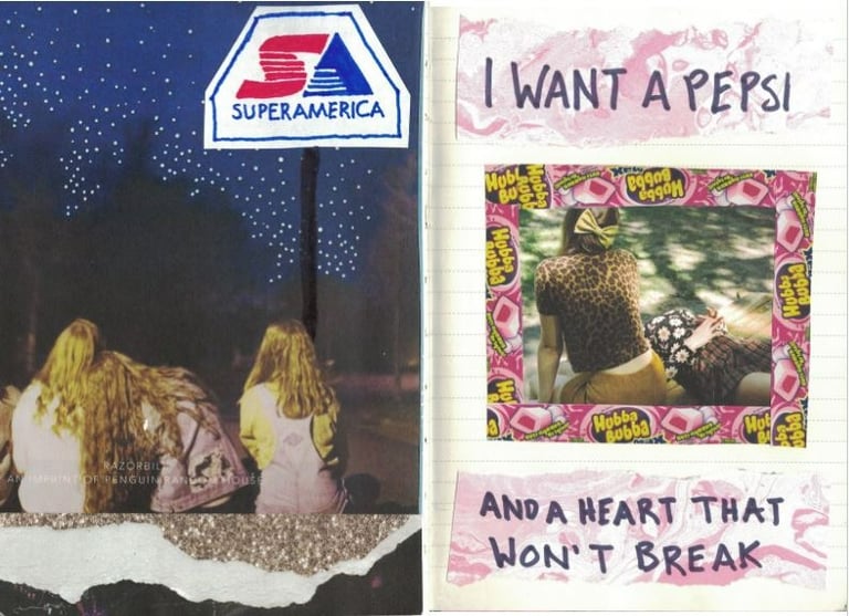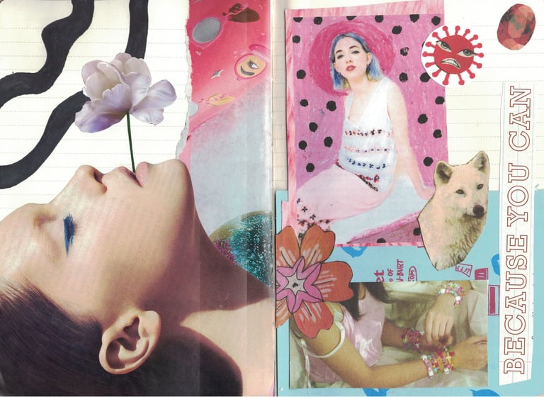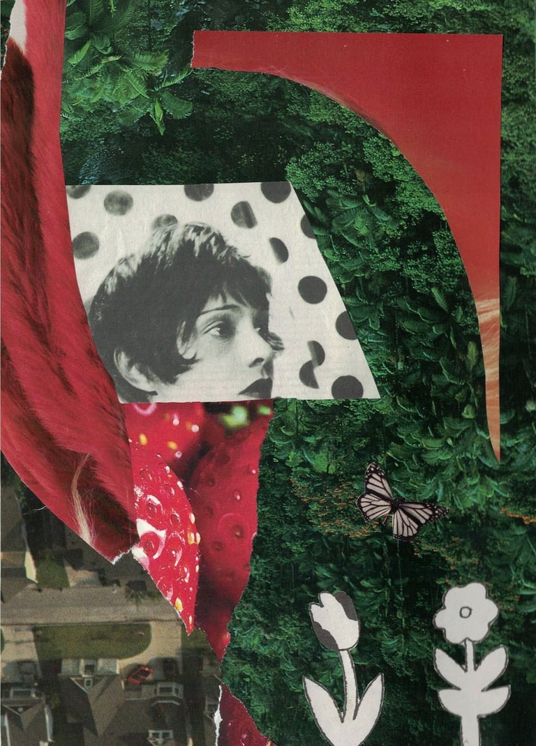 Simone explores pop culture, feminism, queerness, and coming of age through collage art. Her work often uses magazines marketed towards women as a primary resource.