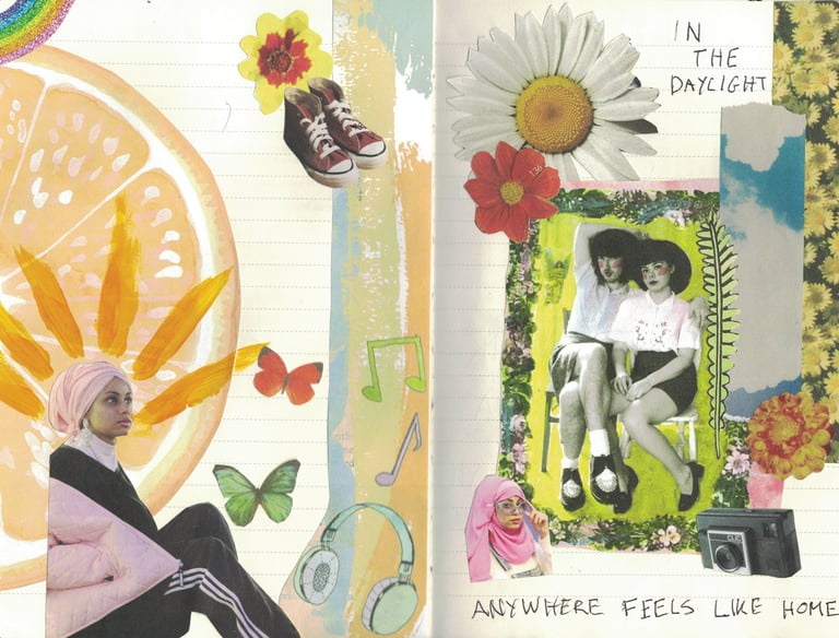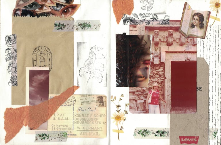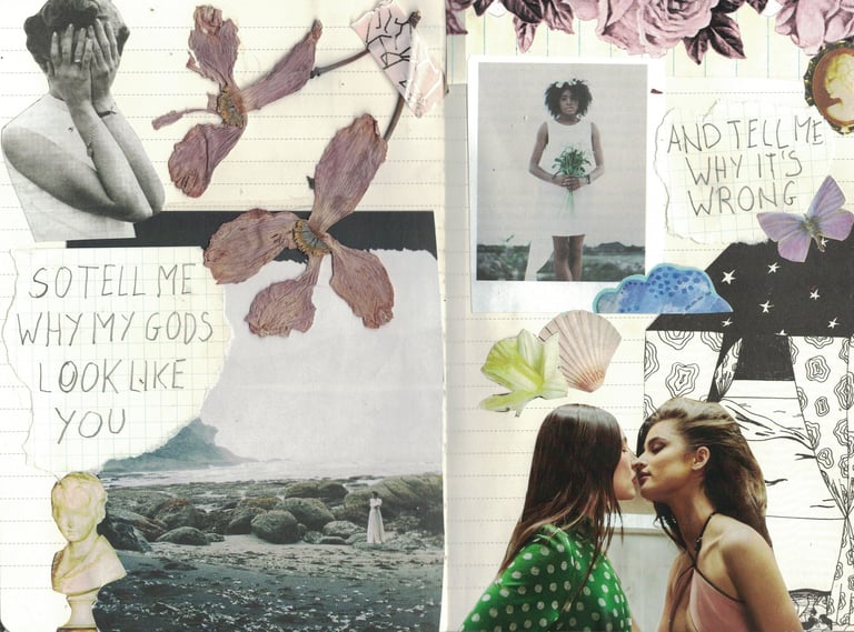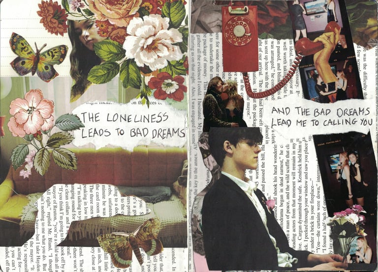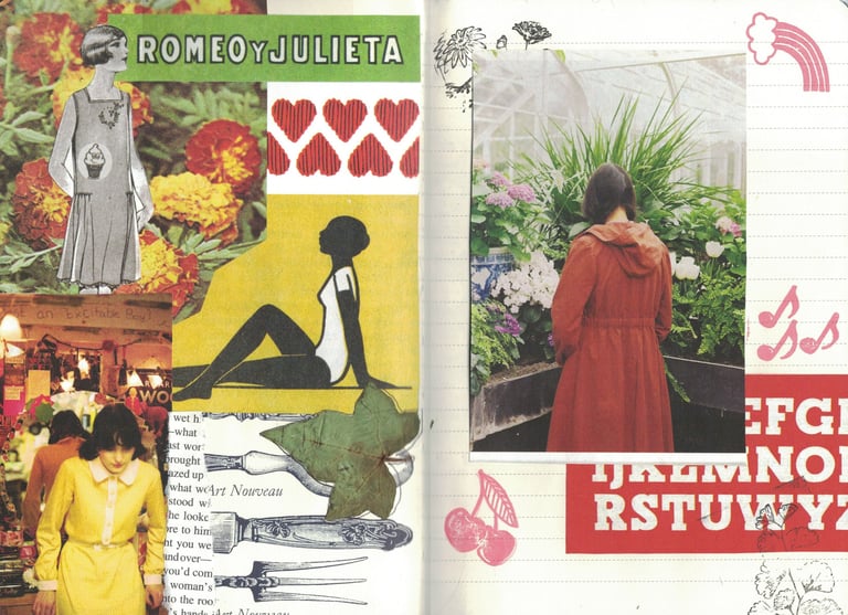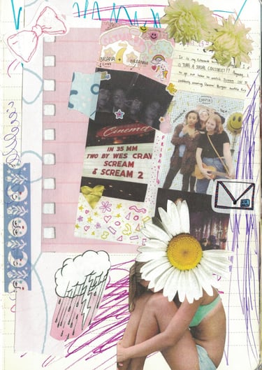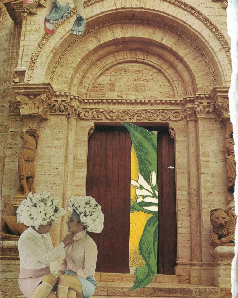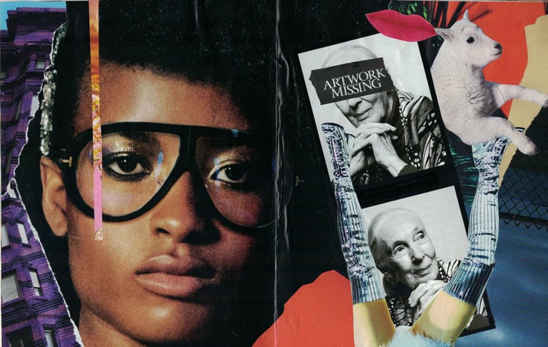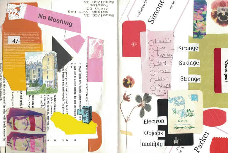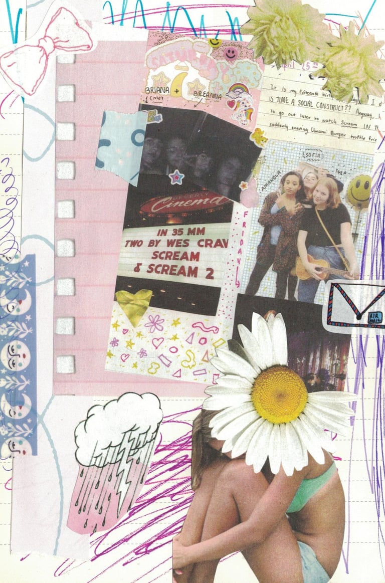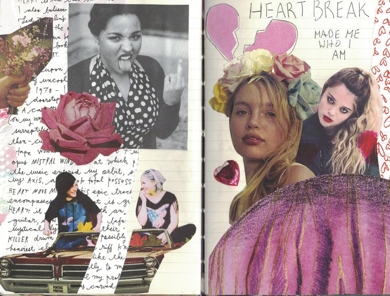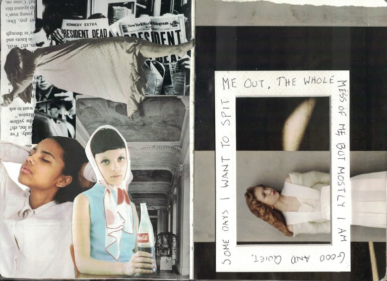 Simone explores pop culture, feminism, queerness, and coming of age through collage art. Her work often uses magazines marketed towards women as a primary resource.