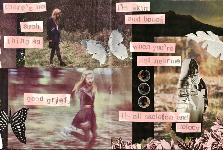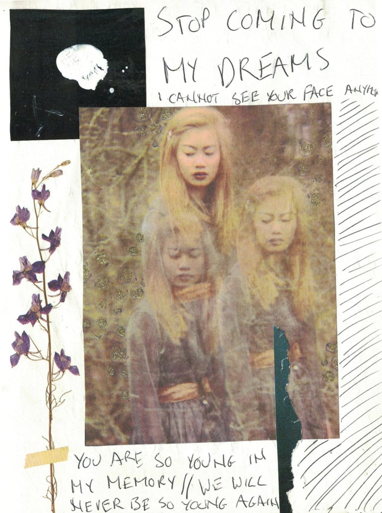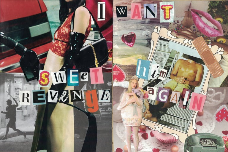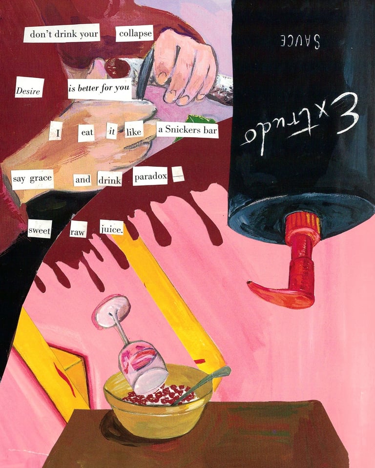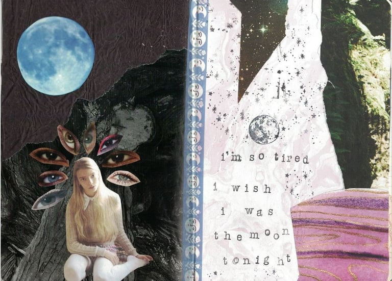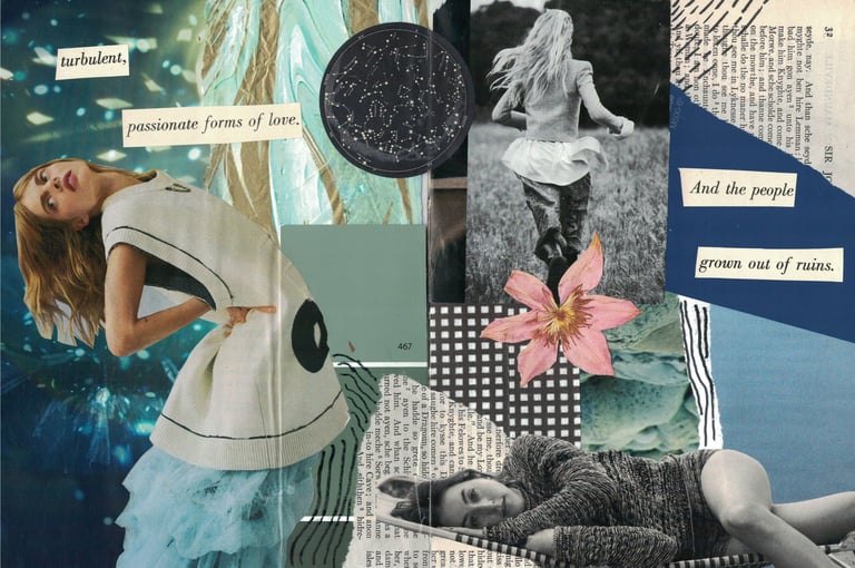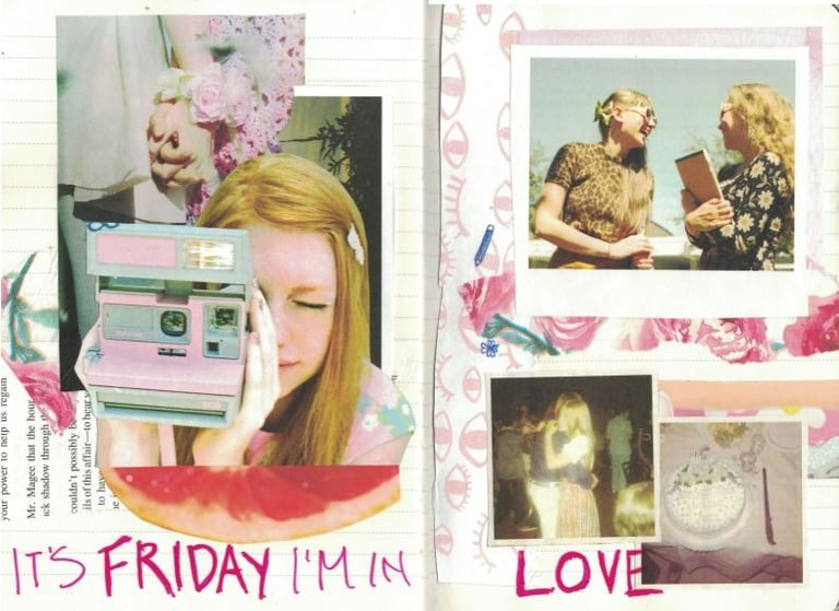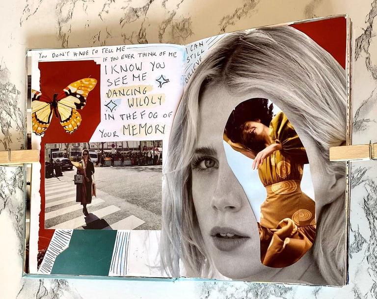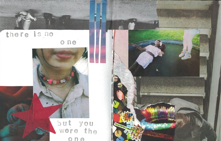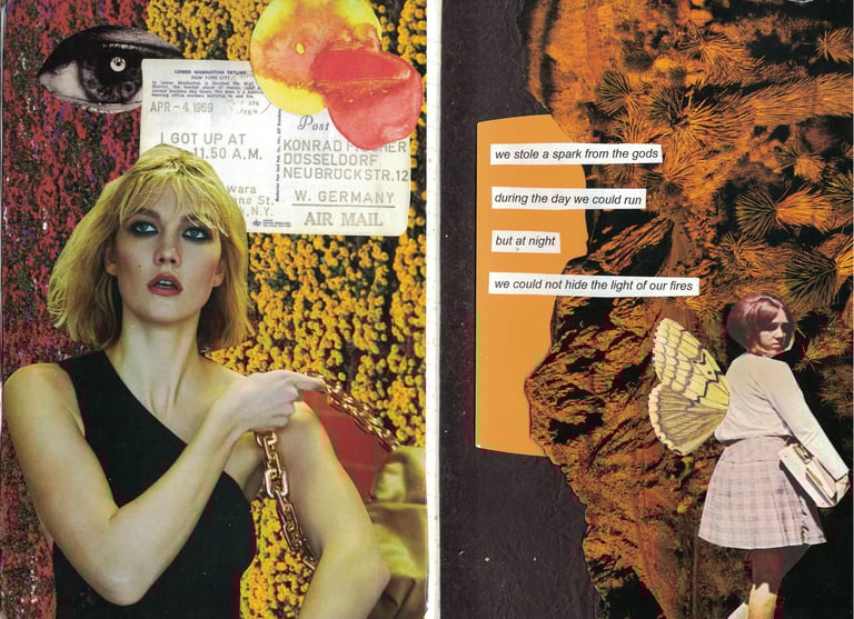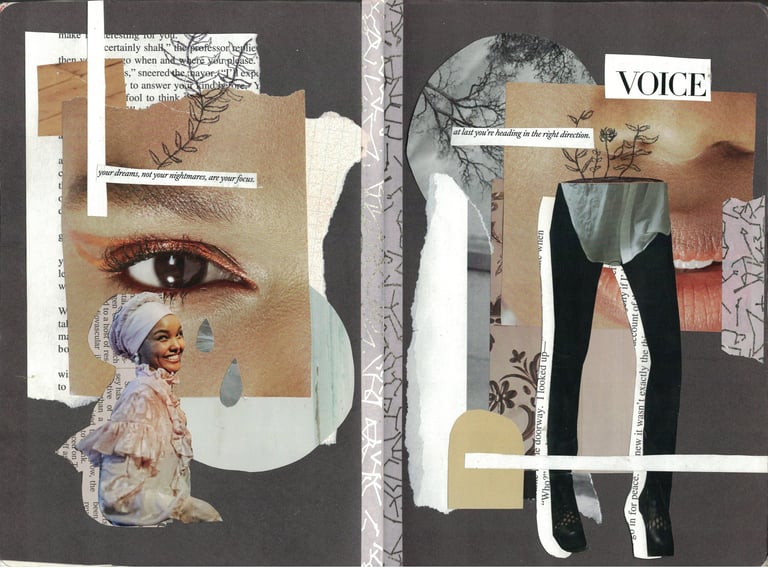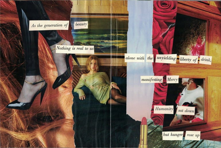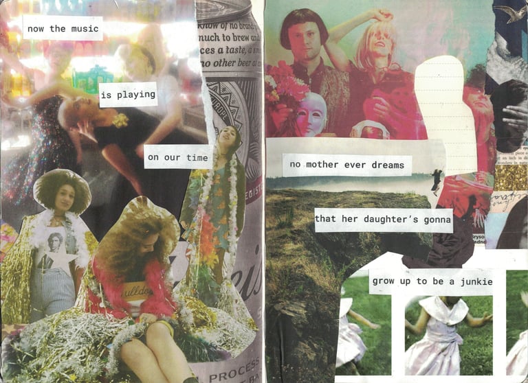 Simone explores pop culture, feminism, queerness, and coming of age through collage art. Her work often uses magazines marketed towards women as a primary resource.